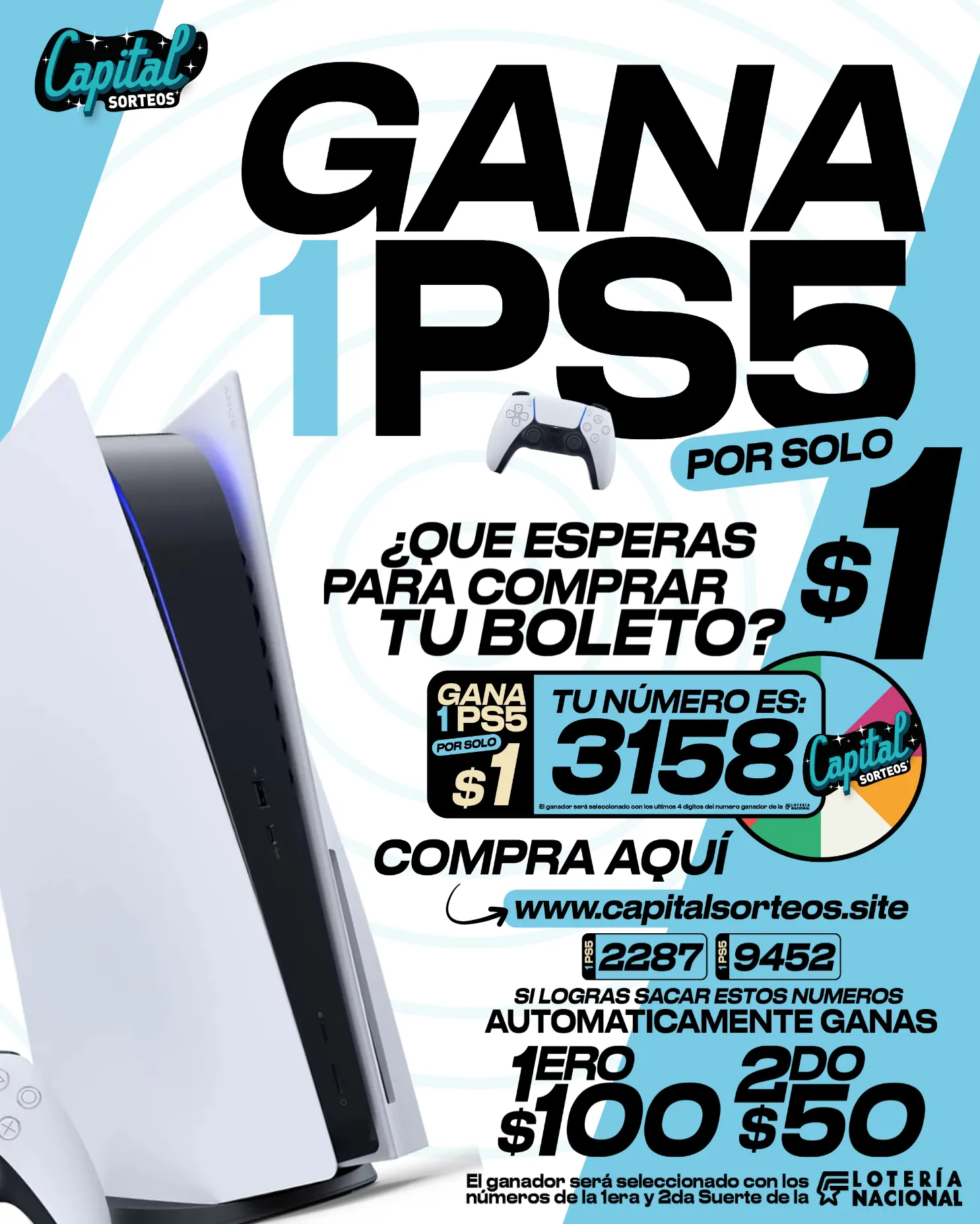 Gánate 1 Play Station 5. Además si te llega a tu correo uno de los números bendecidos te llevas premios en efectivo.